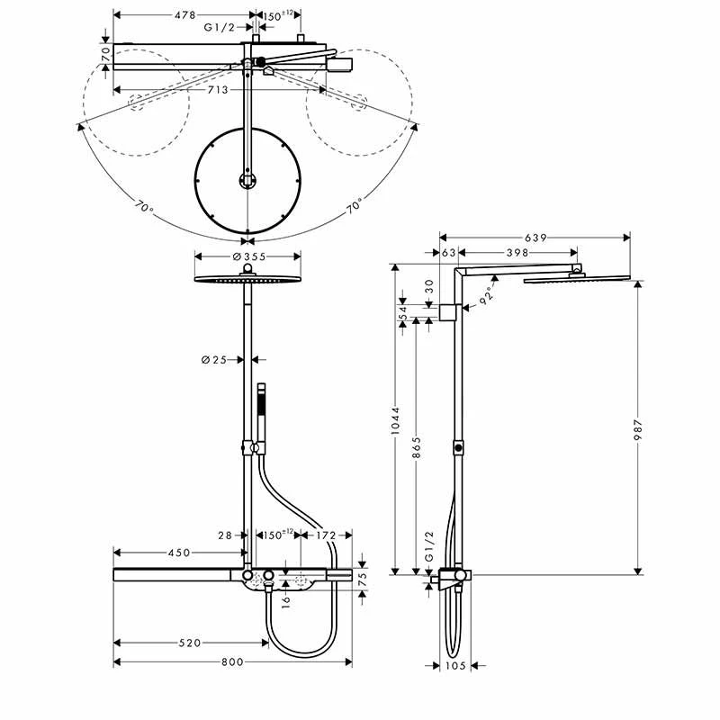 - Consists of: overhead shower, baton hand shower, Thermostatic shower mixer, shower hose, shower holder, shower bar