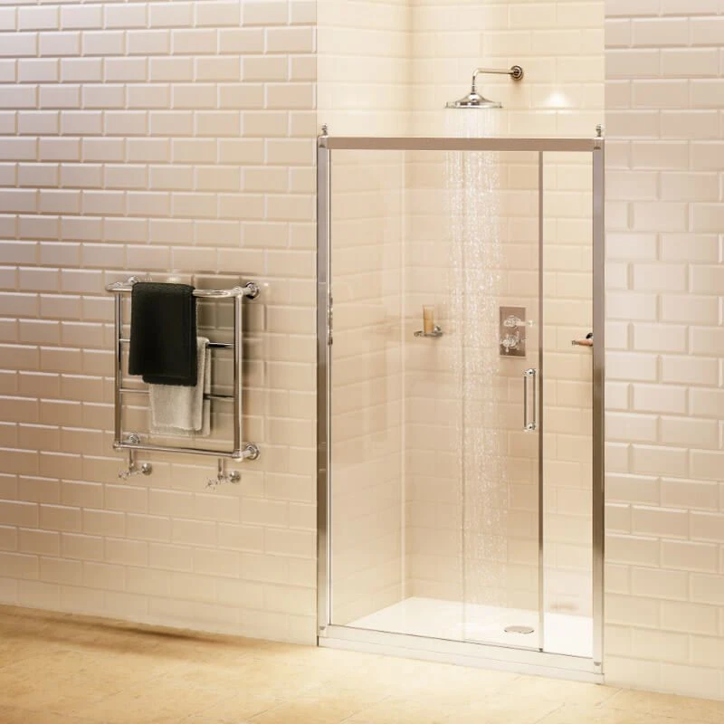 This sliding shower door is elegantly designed, crafted and manufactured by the industry leading traditional brand Burlington. This sliding door will make a deifnite style statement to your traditional bathroom, it is optimal for fitting into a recess but equally can be used with Burlington side panels and inline panels to create a shower enclosure suit to your bathroom.