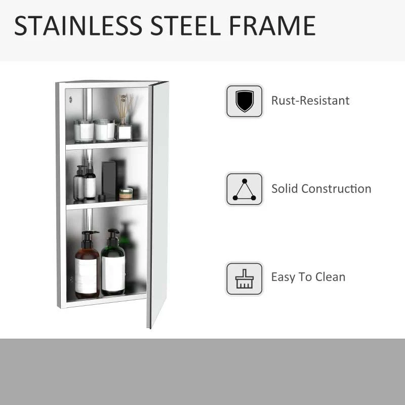 Elevate your bathroom storage with the HOMCOM Stainless Steel Wall Mounted Corner Mirror Storage Cabinet, a stylish and functional solution that maximizes space while keeping your toiletries and essentials organized. Crafted from premium rust-resistant stainless steel, this durable cabinet is designed to withstand the demands of daily use in humid bathroom environments. Its sleek mirrored door provides a convenient reflection for your grooming routine, while the interior features three shelves of varying sizes to accommodate a variety of bathroom essentials, from shampoos and soaps to cosmetics and other must-haves.