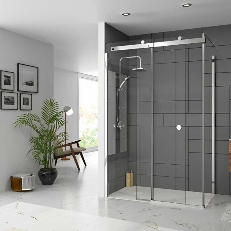 The Merlyn 10 Series Sliding Door is a versatile choice for a shower enclosure. It can be installed with or without a side panel, making it perfect for wetrooms or traditional showers. The door is made from toughened glass with a Mershield Stayclear Easyclean Protected Glass coating, which makes it easy to keep clean. It also has a quiet closing mechanism and a lifetime guarantee on the frame.
