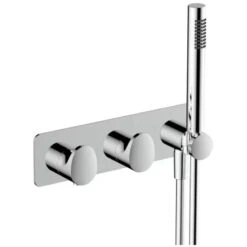 This RAK horizontal dual outlet shower valve with hand shower is finished in chrome. This shower valve is created using the highest quality brass and is supplied with a 15 year manufacturer’s guarantee. This shower valve has been created to control two shower outlets and a hand shower. Consider this concealed shower valve to finish off your bathroom in style.